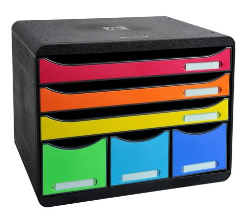 Individuele box met 6 laden, 3 laden voor documenten A4+ formaat en 3 smalle maar hoge laden om klein bureaumateriaal in op te bergen.