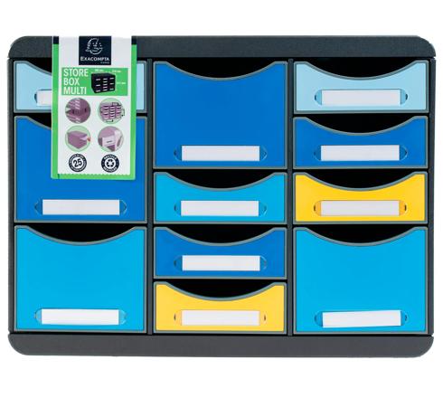 De ladenblok Store-Box Multi Bee Blue met 11 laden is veelzijdig inzetbaar en geschikt voor het opbergen van al uw bureau accessoires. De 7 kleine laden zijn geschikt voor het opbergen van notitieblaadjes, kaarten, pennen, papierklemmen, koffiepads . en de 4 hoge laden zijn geschikt om grotere accessoires in op te bergen zoals een schaar, adapter, batterij, hechtapparaat, stempel ... Deze ladenblok is geschikt voor gebruik op kantoor, thuis of op school.