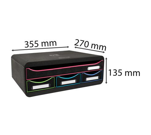 Individuele box met 4 laden, 1 lade voor documenten A4+ formaat en 3 smalle laden voor het opbergen van kleine benodigdheden. Door zijn beperkte hoogte (13,5cm) kan de Toolbox gebruikt worden als monitorstandaard, onderstel voor printer, sokkel voor koffiezetapparaat enz..