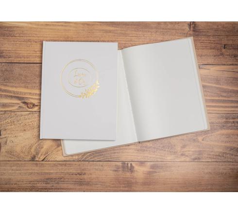 Het Ringflower gastenboek met zijn omslag in lichte tinten en bloemenmotief met gouden accenten, past perfect bij elk huwelijksthema, landelijk, klassiek of romantisch.