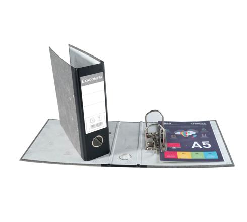 ORDNER MET HEFBOOM IN GRIJS GEMARMERD KARTON - RUG 70MM - A5 VERTICAAL - GRIJS-ZWARTE RUG