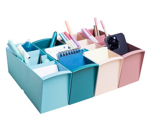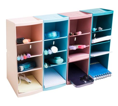Dankzij zijn compacte vorm van 23 cm hoog, 8 cm breed en 11 cm diep past hij op de hoek van elk bureau of op elk schap. De Multi tower is verkrijgbaar in 4 kleuren die passen in elke kantooromgeving of thuiskantoor. De 4 vakken, van 8 tot 11 cm diep, kunnen dienen als pennenhouder, of als opbergbakje voor markers, schaar, post-its, telefoon of andere kleine benodigdheden.