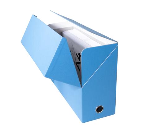 Deze stevige transportbox, gemaakt uit hard karton overtrokken met gestruktureerd gekleurd papier,is erg praktisch voor het archiveren van omvangrijke dossiers.
