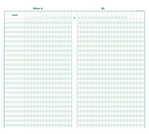 Register voor het noteren en plannen van aanwezigheden, de vakanties, reservaties, oproepen... 1 kolom voor de namen, 31 genummerde kolommen (zoveel dagen van de maand) + 5 extra kolommen - in totaal 46 lijnen.