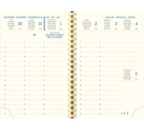 Découvrez notre agenda Vérone au design raffiné avec une couverture amovible en simili cuir lisse et des finitions haut de gamme, dont une piqûre sellier soignée. Organisez facilement votre semaine grâce à une vue d'ensemble sur deux pages en format vertical, couvrant une large plage horaire du lundi au vendredi (7h à 22h). Profitez également d'espaces dédiés pour vos notes du week-end (samedi et dimanche). Ce modèle multilingue est conçu avec une spirale intérieure pour une ouverture à plat, offrant un confort dutilisation optimal.