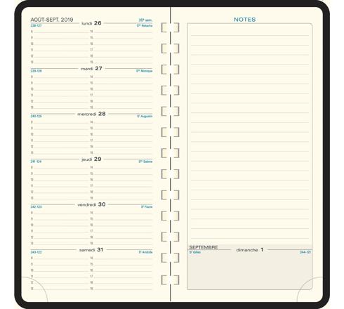 L'incontournable : la semaine sur 1 page à l'horizontale d'un seul coup d'oeil, 1 page de notes, large amplitude horaire du lundi au samedi (8h à 19h) + dimanche entier (pas d'indication horaire), édition française.