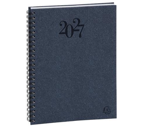Couverture cartonnée, recouverte d'un papier fantaisie. Spirale métal extérieure. Marquage du millésime à chaud. Les + : - impression en bleu et gris, sur papier blanc Clairefontaine, reconnu pour sa qualité et pour permettre une écriture douce et fluide, - tranche naturelle, - emplacements pour les rappels, - coins détachables, pour pouvoir accéder rapidement à la semaine en cours.