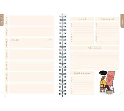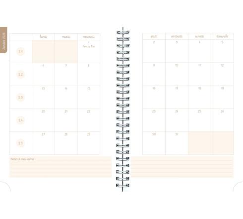 Pages spécifiques : une page de stickers fantaisie en début d'agenda, un récapitulatif des objectifs à la fin de chaque mois, les calendriers semestriels de l'année en cours et de l'année suivante. Couverture imprimée sur une carte souple, effet mat. Imprimé sur papier blanc, finition spiralée, coins détachables pour retrouver la semaine rapidement.