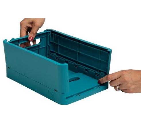 Respectueuse de l'environnement, cette boîte pliable est fabriquée en plastique recyclé issu des déchets ménagers et est ainsi certifiée GRS.