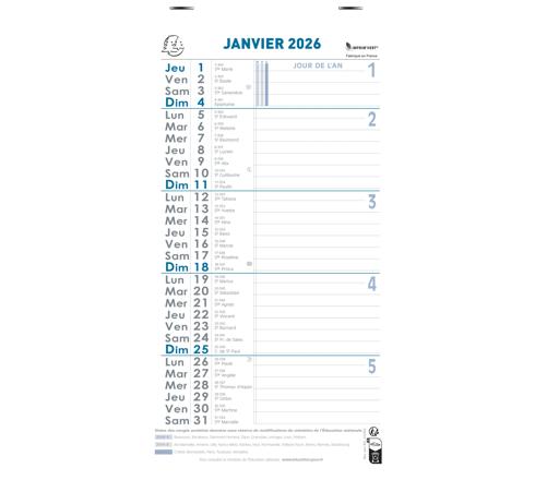 12 feuillets mensuels détachables, avec l'indication des vacances scolaires, les dimanches et les jours fériés sont imprimés en bleu pour les repérer facilement, de la place pour écrire sur chaque jour.