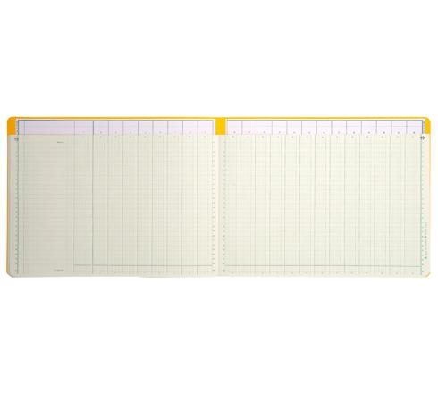 Journal comptable à 22 colonnes. Papier registre 95 grammes légèrement teinté pour limiter la fatigue visuelle - Piqûre 80 pages avec 22 colonnes sur 2 pages - Format horizontal - Dimensions 24 x 32 cm - Couleurs aléatoires : bleu,jaune,vert rouge