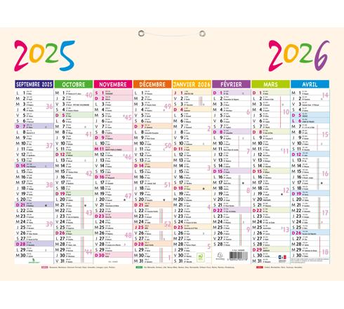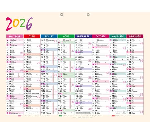Un look classique avec une petite touche colorée. 16 mois (8 mois par face). Grandes grilles = + de place pour noter. Numéro de la semaine pour se repérer plus facilement. Les dimanches et les jours fériés sont en couleurs.