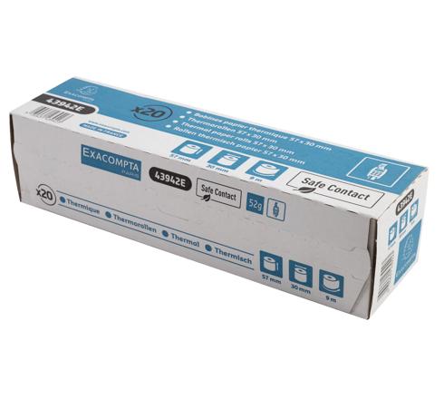 Format de la bobine : 57 mm de laize (largeur) et 30 mm de diamètre. Métrage : 9 m. Mandrin standard de 12 mm. Avertissement de fin de rouleau. Avec mention Safe Contact au verso et logo Exacompta.