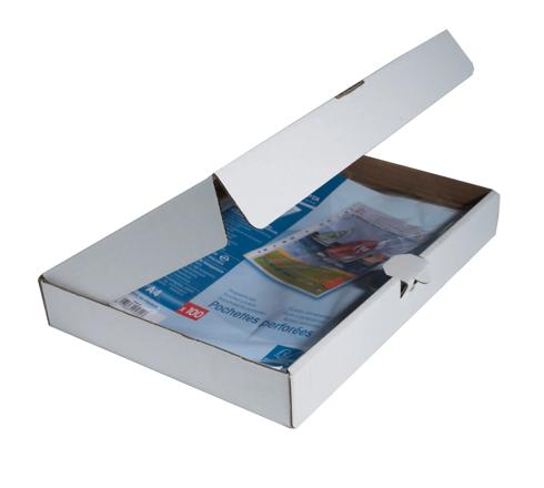 ETUI CARTON DE 100 POCHETTES PERFORÉES OUVERTURE HAUT ET CÔTÉ - POLYPROPYLÈNE LISSE 6/100E - A4 - CRISTAL