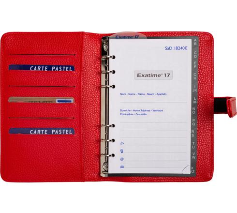 La semaine sur 2 pages à la verticale - amplitude horaire du lundi au vendredi 8h à 20h, samedi 8h à 13h et espace de notes pour le dimanche. Papier blanc impression en bleu et gris. 4 fentes pour cartes de crédit dont 1 emplacement carte avec fenêtre transparente. 1 poche pour glisser des papiers. 1 fente pour bloc note en 3e de couverture.