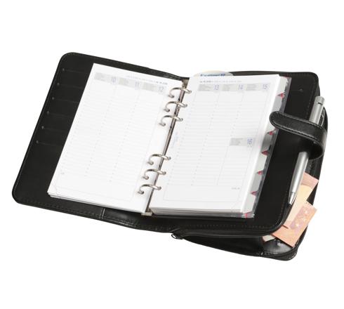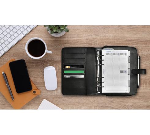 La semaine sur 2 pages à la verticale - amplitude horaire du lundi au vendredi 8h à 20h, samedi 8h à 13h et espace de notes pour le dimanche. Papier blanc impression en bleu et gris. 4 fentes pour cartes de crédit dont 1 emplacement carte avec fenêtre transparente. 1 poche pour glisser des papiers. 1 fente pour bloc note en 3e de couverture.