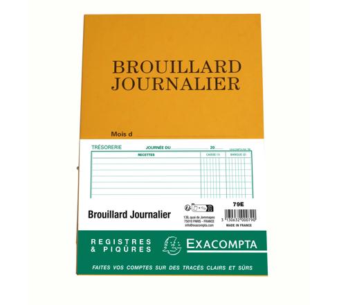 Le brouillard journalier est un livre de compte recettes-dépenses journalier utilisables par tous. Chaque page se divise en 3 parties : les recettes détaillées, les dépenses, et la situation de caisse avec le solde. En entête, est précisé la date du jour . Avec 40 pages, ce support permet d'établir les comptes pour 2 mois environ.