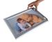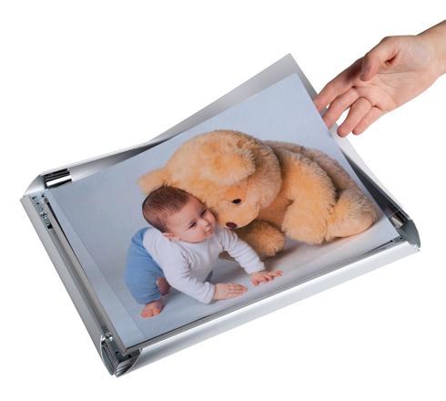 L'ouverture du cadre se fait par l'avant en soulevant ses larges bords en aluminium biseautés pour un changement d'affiche facile.
