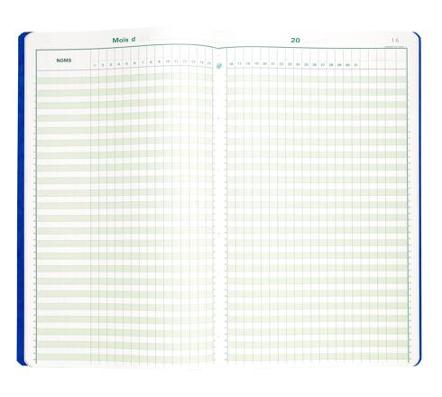 La cahier de pointage sert à faire l'appel, plannifier des réservations ou des congés, noter les présences journalières... .Il possède 1 colonne pour les noms, 31 colonnes numérotées comme autant de jours dans le mois + 5 colonnes supplémentaires, le tout sur 46 lignes.