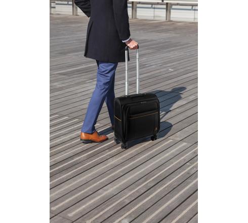 4 ruote multidirezionali a 360°. Interno spazioso con cinghie incrociate per sistemare più facilmente il contenuto. Scomparti separati imbottiti per computer e tablet. Maniglia telescopica retraibile.