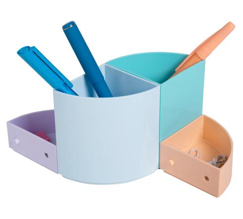 Scomparti intercambiabili tra di loro per creare un organizzatore circolare da scrivania.