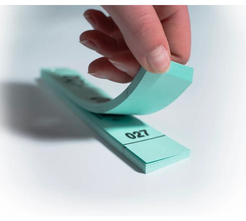 Carnet de 50 tickets détachables en 3 coupons (dont 2 avec trous), en papier cartonné blanc ou couleur.