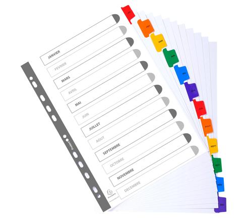 TABBLADEN KARTON 160G - VERSTERKTE GEKLEURDE TABS + INBDEXBLAD - 12 TABS - JANUARI/DECEMBER A4 - WIT
