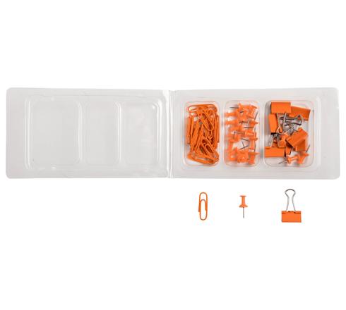 De kit is een plastic etui met 3 verdelingen, en bevat 20 push pins, 30 papierklemmen en 8 dubbele metalen clips.