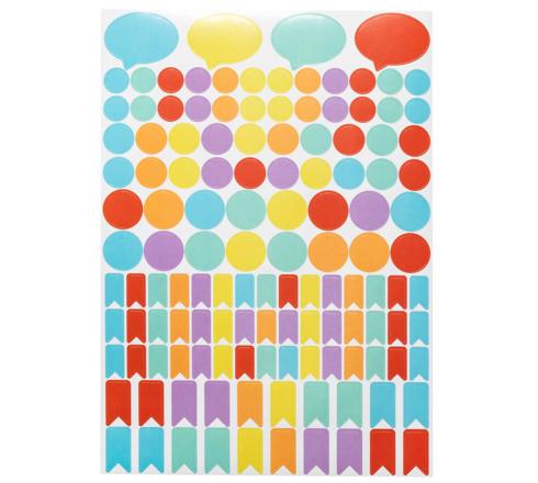 Twee vellen met klassieke stickers in pastelkleuren en twee vellen met trendy en originele stickers in goudkleur, in totaal 300 stickers.
