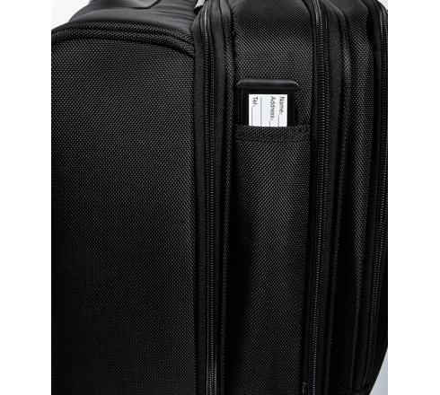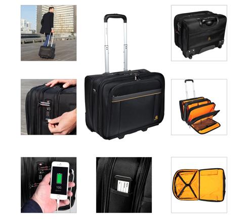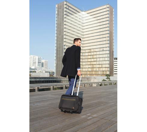 Koffer op wieltjes met telescopisch handvat. De tas heeft 4 afzonderlijke vakken om een laptop, dossiers, kledij en accessoires op t e bergen. Op de rug heeft de trolley een vak met dubbele opening om de tas over een telescopisch handvat van een koffer te schuiven.