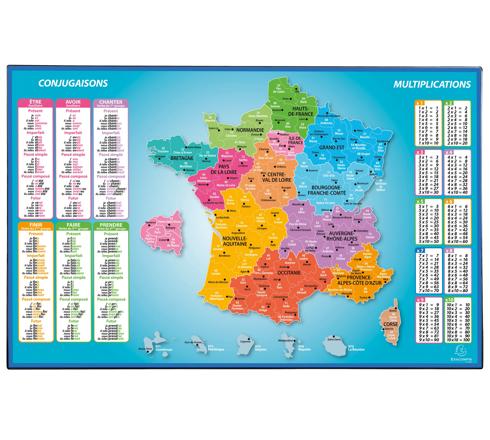 Een educatieve onderlegger waarop de kaart van Frankrijk, de tafels van vermenigvuldiging en de belangrijkste vervoegingsregels staan afgebeeld. Om de namen van Franse steden en regio's aan te leren en te oefenen en de regels van vermenigvuldiging en de belangrijkste vervoegingsregels te herhalen.