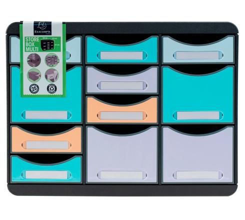 De ladenblok Store-Box Multi Aquarel met 11 laden is veelzijdig inzetbaar en geschikt voor het opbergen van al uw bureau accessoires. De 7 kleine laden zijn geschikt voor het opbergen van notitieblaadjes, kaarten, pennen, papierklemmen, koffiepads . en de 4 hoge laden zijn geschikt om grotere accessoires in op te bergen zoals een schaar, adapter, batterij, hechtapparaat, stempel ... Deze ladenblok is geschikt voor gebruik op kantoor, thuis of op school.