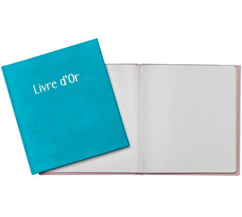 Een stijlvol gastenboek met goudkleurige reliëfopdruk 'livre d'or' op de omslag.