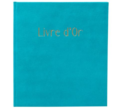 Een stijlvol gastenboek met goudkleurige reliëfopdruk 'livre d'or' op de omslag.
