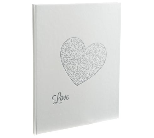 Un livre d'or blanc à la couverture blanche légèrement pailletée, et ornée d'un marquage coeur argenté, pour conserver le souvenir des moments forts de la vie.