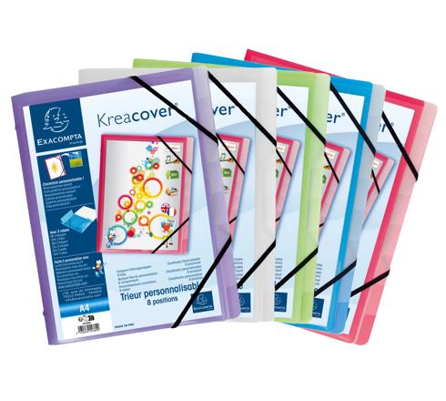 De omslag in polypropyleen biedt het product een lange levensduur. Vakje op de omslag om uw sorteermap te personaliseren met Kreaman op www.exacompta.com