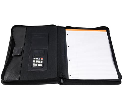Handige en stevige conferentiemap met ritssluiting. Map met drukknop voor A4-documenten, met een pennenhouder en plaats voor visitekaartje.