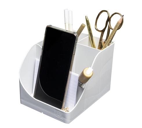 Een pennenhouder met grote opslagcapaciteit dankzij de 5 vakken van verschillende hoogte: 4 hoge vakken voor het opbergen van grote benodigdheden zoals schaar en pennen, en 1 lager vak voor het opbergen van kleine spullen zoals paperclips, duimspijkers, USB-sticks of zelfs een smartphone.