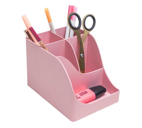 Een pennenhouder met grote opslagcapaciteit dankzij de 5 vakken van verschillende hoogte: 4 hoge vakken voor het opbergen van grote benodigdheden zoals schaar en pennen, en 1 lager vak voor het opbergen van kleine spullen zoals paperclips, duimspijkers, USB-sticks of zelfs een smartphone.