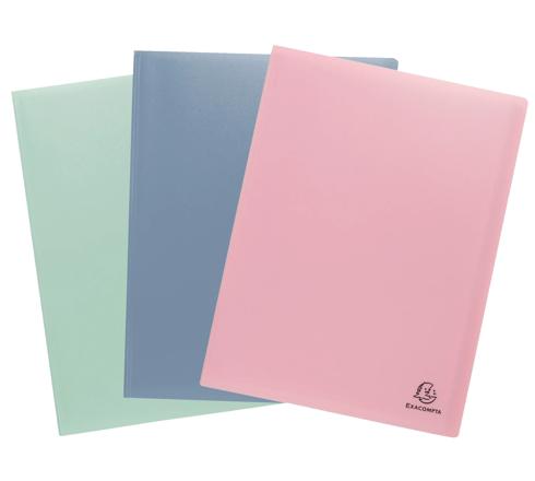 Omslag in matte halfharde gerecyclede polypropyleen 5/10e, vlek- en krasbestendig. Insteekhoezen in gestructureerde gerecyclede PP met antireflecterende coating zorgen voor een goede transparantie.