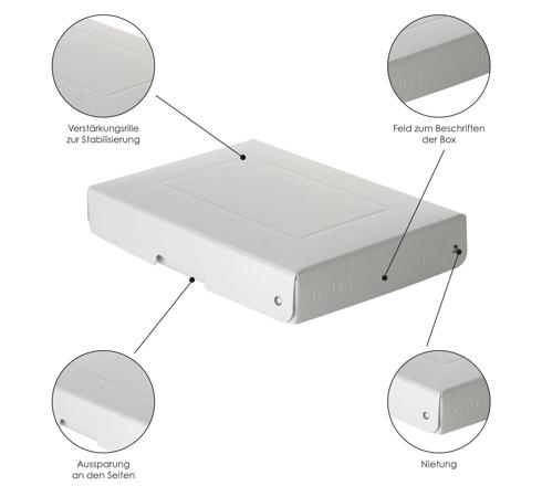 Deze Pure Box Pro-serie vormt een aanvulling op de Pure Box-serie en onderscheidt zich door de DIN ISO 9706-, DIN ISO 16245- en Photographic Activity Test-certificeringen voor professioneel gebruik. Op de binding met rivetten geldt een garantie van 10 jaar.