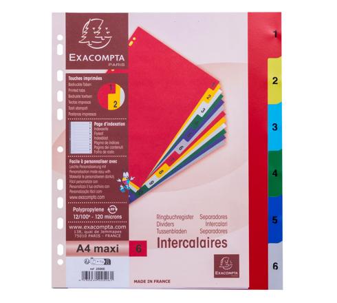 TABBLADEN MET BEDRUKTE TABS IN GEKLEURDE PP - 6 TABS - 1 TOT 6 - A4 MAXI - GEASSORTEERDE FELLE KLEUREN