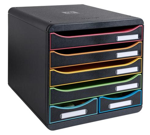 Le Module de classement Big Box Maxi Black Office d'Exacompta est composé de 6 tiroirs, 4 grands et 2 petits pour classer des documents en format A4 et A4+, des pochettes à élastiques 24x32cm, des enveloppes grands formats mais aussi de petits objets de bureau comme des posts it, trombones, capsules de café... Il est adapté à un usage bureau, home office ou scolaire.