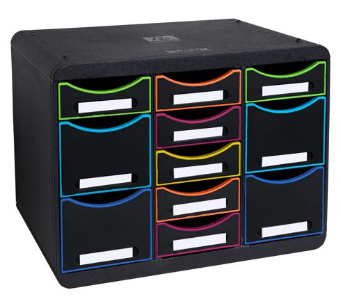 De ladenblok Store-Box Multi Black Office met 11 laden is veelzijdig inzetbaar en geschikt voor het opbergen van al uw bureau accessoires. De 7 kleine laden zijn geschikt voor het opbergen van notitieblaadjes, kaarten, pennen, papierklemmen, koffiepads . en de 4 hoge laden zijn geschikt om grotere accessoires in op te bergen zoals een schaar, adapter, batterij, hechtapparaat, stempel ... Deze ladenblok is geschikt voor gebruik op kantoor, thuis of op school.
