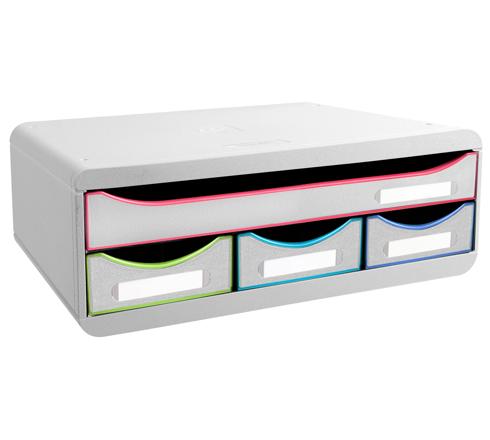 Individuele box met 4 laden, 1 lade voor documenten A4+ formaat en 3 smalle laden voor het opbergen van kleine benodigdheden. Door zijn beperkte hoogte (13,5cm) kan de Toolbox gebruikt worden als monitorstandaard, onderstel voor printer, sokkel voor koffiezetapparaat enz..