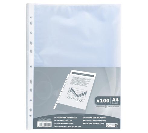 PAK VAN 100 GEPERFOREERDE SHOWTASSEN IN GEKORRELDE PP 38MICRON - A4 - KRISTAL DOORSCHIJNEND