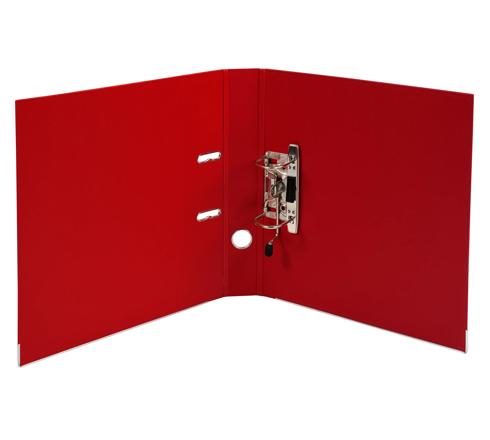Een ordner met metalen grijpring, sleuven en randbescherming. Binnen -en buitenzijde met PP overtrokken.