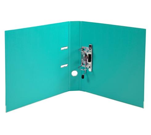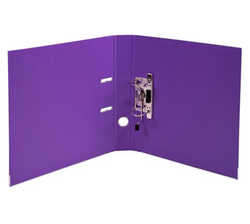 Een ordner met metalen grijpring, sleuven en randbescherming. Binnen -en buitenzijde met PP overtrokken.