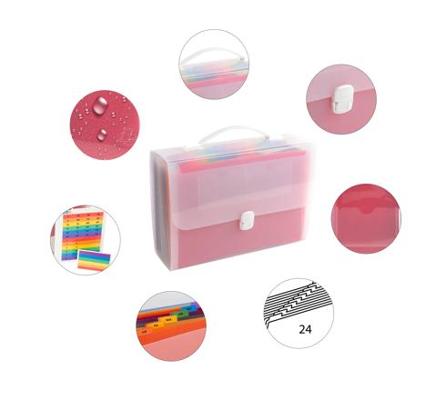 Deze koffer, volledig gemaakt van polypropyleen, met een stevige handgreep, heeft een zeer grote opslagcapaciteit van ongeveer 800 vellen verdeeld in 24 vakken.