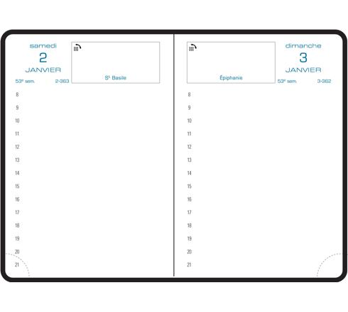 La journée sur 1 page, large amplitude horaire de 8h à 21h, édition française. Les + : - impression en bleu sur papier blanc Clairefontaine, reconnu pour sa qualité et pour permettre une écriture douce et fluide, - tranche naturelle, - coins détachables, pour pouvoir accéder rapidement à la journée en cours.
